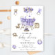 Inbjudan visar vattenfärg i en baby-vagga, en yngelmobil i form av lila runt moln, barns leksak: en elefant för gnagare, en anka på hjul, en nalle, en bunny, en bib, en nappar, en pyramid.