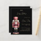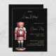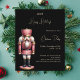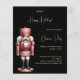 För en jul party med familj och vänner. Svart bakgrund och en nötkrackare soldat som dekoration. Anpassa och lägg till informationen. Golden text. 1 lakan = 1 inbjudan tryckt kant till kant.