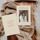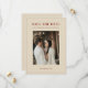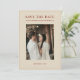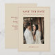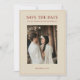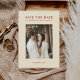 Detta chic Spara datumet-anmälan har en modern kokboksliknande känsla. Den minimalistiska framsidan har ett foto, klassisk serif-text och en krämig beige bakgrund. Baksidan av anmälan har utrymme för ett formellt meddelande om att spara datumet.