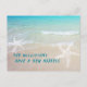 Nytt adress vykort med strandtema. Konstruktion av sjö- och sand- och stjärnfisk med två textmallar. Tropiskt blått hav vatten är bakgrunden till texten. På framsidan "Vi/jag har en ny adress" eller "Vi/jag har flyttat". Inkludera namn och adress med ny bosättning på baksidan. Genomskinliga vita havsstjärnor dekorerar båda sidor.