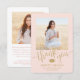 Skicka ett stilfullt tackkort med anpassade 2-foto blush rosa och guld examens tack-kort. All text på denna mall är enkel att anpassa med ny adress, kontaktinformation, framtida utbildningsplaner, jobbtitel, favoritcitat eller annan text du väljer. Om du hellre vill skriva ditt meddelande för hand tar du helt enkelt bort exempelteaten för ett tomt kort. Dessutom kan alla färger och typsnitt ändras med Zazzles designverktyg. Den moderna blush rosa designen har en examensmössa, chic trendy kalligrafi, minimalistisk klassisk typografi och två foton som du väljer, till exempel seniorbilder eller bilder från examensceremonin. Observera att guld är tryckt färg, inte metallfolie. Dessa eleganta personliga kort är ett elegant sätt att tacka familj och vänner för att de deltog i din examensfirande. Grattis till examen!