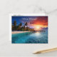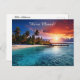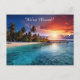 En underbar tropisk strand med vatten, sand och handflatan träd under uppställningen sol skapar ett fantastiskt nytt adress vykort.