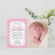 Skicka dina vänner och familj de underbara nyheterna om ankomsten av din lilla en med dessa anpassningsbara bebisannonser. En underbar design med rosa bakgrund och hjärtan. Bebispojke finns också tillgänglig i denna stil.