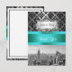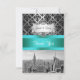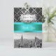 NY City Skyline BW B3 Damask F2 - Inbjudan till Anpassade och tillbehör med en ikonisk vy av New York City-skylinen från överdelen av 30 Rockefeller Center, med ett svartvitt foto från Byggnaden Empire state, underlägset Manhattan inklusive World Trade Center. Den har också ett svart dämpningsmönster mot en övertoningsbakgrund för grått i silver och ett turkosfärgat band. Den har också en vit övertoningsetikett i ett silver-utseende ram. Den här produkten ingår i en uppsättning matchande utformningar som är lätta att anpassade för många tillfälle och händelser. Om du behöver separat matchande OSA kort, Tackkort, Frimärke, magneter eller andra tillbehör ska du checka ut våra andra listor. Om du inte ser en matchande produkt som du är intresserad av, eller vill se den här designen i olika färg eller med andra NYCisMyMuse-foton som du ser i vår butik, kontaktar du oss så att vi kan ta emot dig i lycklig. Observera att detta är en grafisk design och inte innehåller några egentliga tyger, metall eller prägling.