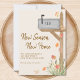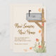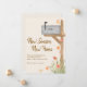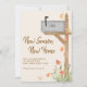 Det här reklamkortet för fallande flytta har en vattenfärgspostlåda och löv på en krämbakgrund. Det står "New Season New Home" i snyggtens typografi. Anpassade enkelt med ditt nya adress nummer och husnummer på postlådan. Ursprunglig vattenfärg © Michele Davies.