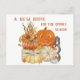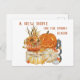Halloween fick vykort för flytta. Säg happy halloween och låt alla veta din nya adress samtidigt. Rustik vattenfärgsdesign för lantbrukare i könsneutral färg, rik höst av bränd orange, gyllene gult och grått. I illustrationen finns en orange som pumpas med solblommor, jack o lantern och vita pumpor på en bondgårdsträ låda, som dekoreras med höst löv och BOO-porktecken. Meddelandet heter "Ett nytt hem för talessäsongen" och du kan anpassa meddelandet på baksidan.