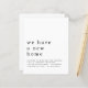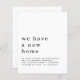 Ny heminformation om enkel Flytta. Ett budgetvänligt SMALLER-alternativ på 4,5 x 5,6 tum som ger råd till din nya adress. Finns på ett SEMI GLOSS 110 lb-kort LAGRAR eller ett SATIN AVSLUTAR 80 lb TINNER PAPPRA LAGRAR. Kuvert är ett valfritt extra. Huvudet är stort i gemener av snyggten med informationen under. Det finns mycket tomt utrymme överst för contemporaryns känsla! Anpassa texten till dina egna detaljer.