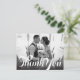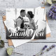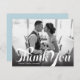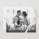 Ett skript i vintage stil och en gradient för mörk överträffar ditt favoritfoto av tacksamhet i bröllop. Använda det tomma utrymmet på baksidan för att skicka skriva ett personligt meddelande till vänner och familj. Den här designen kan anpassas till antingen liggande eller porträtt fotolayouter.