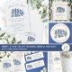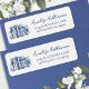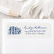 En charmig returadressetikett inspirerad av temat ”Ett nytt kapitel börjar”, perfekt för en babyfest eller bröllopsfest. På vänster sida är en akvarellmålning av en gammal öppen bok stiliserad i mjuka nyanser av blått och vitt med känsliga chinoiseriemönster, accentuerad med subtila vilda blommor i dämpade blå, marinblå och mjukt grå toner för en förfinad saga-känsla.