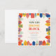 "Nytt barn på blocket": babyduschen med gräns i färgade hus och byggnad ljusa färger med text i mitten.