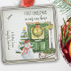 Första julen i ny hemmiljö - som du kan redigera för ensamstående, par och familjer och anpassa dig till helgdag och din nya adress. Festiv christmas frontdörrutformning, dekorerad med hollöns andedräkt och trädgård. Scenen ställs in med mysiga inslag, inklusive glowing lantern, julgran, snögubbe och sledge.