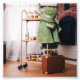 Jacka hängde på en rullvagn nära en resväska på marken.