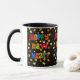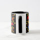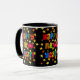 Ett nytt års ringfärdsring Mugg med "Gott nytt år" i flerfärgat brev och orange och gult börjar spridas över hela den svarta bakgrunden. Från en handmålad papper kollagedesign av Judy Adamson.