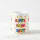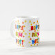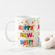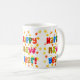 Ett nytt års vita kaffe Mugg med "Gott nytt år" i flerfärgat brev och orange och gult börjar spridas över hela vita bakgrunden. Från en handmålad papper kollagedesign av Judy Adamson.