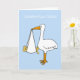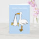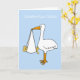 En stor tecknad stork som levererar en ny valp, som ligger i ett vitt lakan. Bilden ställs in mot en plåt-blå färgad-bakgrund. Ett humoristiskt grattis kort eller gåva till vem som helst som antar ett nytt "päls baby".