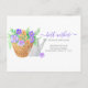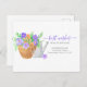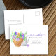 vykort för söt flyttas meddelande med tema för vattenfärg och handskript. Utformningen har en rattan basket-planter med blommor från lila och aprikoser i orange, en handgaffel och en vattenburk. Det står "best önskemål från mitt nya hem" följt av ditt namn och nytt adress. Du kan också lägga till ett personlig-meddelande på baksidan.