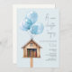 "Ett nytt kapitel", babyduschtema med illustration av en mini grannutlåning bibliotek med blå ballonger och ljusblå bakgrund.