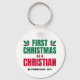 Snyggt FÖRST CHRISTMAS SOM EN KRISTSK NYBAR nyckelkedja med ANPASSADE TEXT & DATE. Utformningen visar grönten vid jul och den röda julen sans serif-typografi med rött och grönt holly inslag. En underbar festlig nyckelkedja för en ny kristen troende. Du kan PERSONALISERA TEXTEN med ditt namn, bibelns favoritversaler eller annan text och annat år (eller ta bort). Idealisk som kyrkans julhandel för nya troende som firar sin första kristna jul. Dessa kan ges som strumpor och som gåvor. Matchande gåvor är tillgängliga.