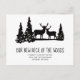 Berätta för vänner och familj om din ny adress med dessa ryttiga meddelanden om svart och vit flytta. Utformningen har två hjortar omgivna av gräs träd, i svart på vit bakgrund, ovanför ord "Vår nya Nacke av Skogen" i handtryckt teckensnitt. Lägg till ditt namn och ny adress nedan.
