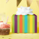 Detta ljusa inslagspapper har kraftiga ränder i retroinspirerade nyanser av grönt, lila, orange, blått och gult. Roligt för alla tillfällen.