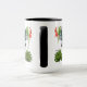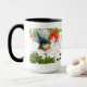 En kaffekopp med en bakgrundskarta över North Island, vår infödda fantail-fågel och infödda Kaka Beak-blomma på den.