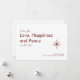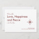 Nyår Peace och kärlek 2026-kort med röd typografi. Med anpassadets text kan du lägga till din egen familj namn. En vit snöflingbild accentuerar kortets framsida och med en vit bakgrund på baksidan. Ett enkelt sätt att skicka er önskemål av kärlek och fred under det nya året.