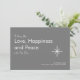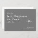 2026 års nya fredskort med vit typografi på grått-bakgrund. Med anpassadets text kan du lägga till din egen familj namn. En vit snöflingbild accentuerar kortets framsida och med en vit bakgrund på baksidan. Ett enkelt sätt att skicka er önskemål av kärlek och fred under det nya året.