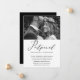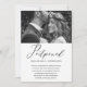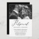 Eleganten ändrar datumet för uppskjutandet av bröllop. Detta enkla tillkännagivande är ett chic för att informera inbjudna gäster om att ert bröllop-datum har flyttats på grund av oförutsedda omständigheter och inbegriper det nya bröllop-datumet. Det här trendiget har ett vackert "senarelagt" svartfärgat skript på en vit bakgrund med parets foto och ett svart baksida av kortet.