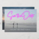 Liggande foto med ett andra foto på baksidan (tillval). "Spara datumet" i magenta färg, plats och går att redigera
