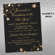 Svart bakgrund med ljusa guld-stjärnor på övre och grund-hörnen, attraktivt skript och typografisk text typsnitt, dekorera denna 4,25-tums x 5,6-tums porträtt-inbjudan, med en magnet bakåt, för Nyårsaftonen party. Finns även i storleka 5 x 7. Det är enkelt att redigera all text med hjälp av mallen. Du kan lämna valfri text/linjer tomt om du vill ta bort. Högkvalitativ, fullt-färg, utfallande utskrift från fullt. Ett vitt standardkuvert medföljer, kontrollera "inget" för en reducerad pris. Se "Om den här produkten" på sidan för mer information.