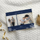 Elegant och modernt helgdag-fotokort har två favoritfoton som är placerade sida vid sida, med "Gott nytt år" överst i vit kursiv stil och blocktypografi. Anpassa med anpassningsbarna hälsning och namn vid grund, accentuerat av fyra vita snöflingor. En rik marin blå bakgrund gör din Julhälsningar elegans mer klassisk. Kortet återgår till ett snöfall mönster i chic grått.