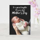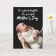 Det här kortet har en vertikal scen mot en djup kolbakgrund, där en nyfödd sover fridfullt i en krämstickad outfit med små knappar, väl gömd i ett par vuxna händer. Mjukt ljus faller över barnets varsamt rodnade hud, och det lite sneda huvudet med slutna ögon ger en tyst, tillgiven närhet ❤️. Den stickade texturen ser mysig ut mot barnets släta kinder, vilket ger en känsla av värme och omsorgsfullt skydd på ett sätt som känns intimt och ömt. Nära toppen står det med vita bokstäver ”Till en speciell dotter”, ovanför en andra rad som säger ”På din första mors dag”, båda centrerade och lätta att hitta. Den enkla färgpaletten håller fokus på de omsorgsfulla händerna och det lugna uttrycket, som en privat stund som delas mellan familjemedlemmar. Subtila skuggor runt kanterna ger scenen djup, medan den mjuka fokusen håller allt mjukt och lug