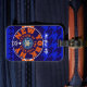 Bagagetagblått med orangens tandtanddesign och med blå, orange och vit, koncentriska cirklar och "NEW YORK, NY CENTER OF THE UNIVERSE" och New Yorks Underbara försegling i mitten och "New York, NY" överst i skriften med Y-NOT-ME. Den här designen är en utflykt till staden som aldrig sover, New York City, New York.