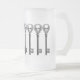 Denna frostade glass ölmugg är en av en eklektisk uppsättning av muggar för vintagesteampunköl, och den har en bild av en skelettnyckel på den.