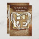 Den här inbjudan till det sterila landsbyggsbröllopet har en KÄRLEK-formgivning med ett tygel i form av ett hjärta och ett nyckel hängande från det. Det står: "Han håller nyckel i hjärtat." Bakgrunden är en rustik överlappningsdesign. Bromsen är bara en tryckt design, inte en riktig brännväv. Den andra sidan av inbjudan har samma utformning som land stil med ordalydelsen för bröllopsinbjudan. Dessa unika bröllopsinbjudningar är underbara för ladan bröllop, land stil bröllop och det orustiska temat bröllop.