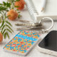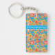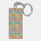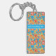 Glöm aldrig nycklar igen! Lägg till ditt mobila nummer eller namn i den här söt fyrkantiga akryliska nyckelkedjan, med mönster av dilaterad orange, rött och gula blommor på en turkosblå bakgrund, från en handmålad papper kollage av Judy Adamson.