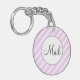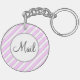 En nyckelkedja för din postlåda med skript brev på en rosa stripe mönster med tunt grått rand på vitt.