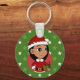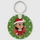 Med en illustration av en söt, leende lycklig-flicka med långt brunt hår bär hon röd och vit Jultomten kostym och håller en present; helgdagar med en sömlös grönt med stjärnor