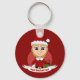 Nyckelkedja med en illustration av en söt leende lycklig-flicka med kort blond hår, hon bär röd och vit Jultomten-dräkt och håller en present. Med redigerbar textmall för ditt namn eller meddelande, juldesign med röd bakgrund, helgdagar med röd bakgrund