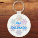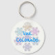 Underbar tittar nyckelring, med mycket färglöst snöflingor. Texten läser Vail Colorado och kan ändras för att läsa vad du vill.
