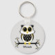 Grundläggande nyckelkedja med guld, svart och vitt uggla på ett ben med löv och bär.