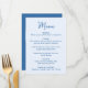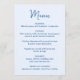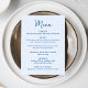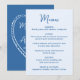 Dela din välkomstmeny med stil med detta fantasifulla menykort som är designat för att samordna med modern och lekfull bröllopsdekor. Framsidan av menyn visar ”Meny” i en handskriven blå skrift med detaljer om er meny listade nedanför på en ljusblå bakgrund, vilket ger ett fräscht och glatt uttryck på er fest. Baksidan av menykortet visar ett handritat, ljusblått hjärta runt parets namn och bröllopsdatum, vilket ger en söt och sammanhållen detalj. Perfekt för par som planerar en rolig och romantisk fest, denna anpassningsbara bröllopsmeny lägger till färg och personlighet samtidigt som menyvalen är lätta att läsa för era gäster.