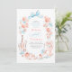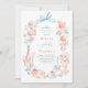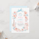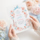 Blå slinga & rosa blommor - Inbjudan till repetitionsmiddag. Sätt en charmig och sofistikerad ton för din förlovningsfirande med denna fantasifulla inbjudan till repetitionsmiddag. Designad för den moderna bruden som älskar en "ny traditionalistisk" estetik, har denna inbjudan en sällsam, handmålad akvarellblommig krans dekorerad med en signatur ljusblå kokett slinga. Det konstnärliga arrangemanget inkluderar skräddarsydda illustrationer av champagne, en flerskiktig tårta, vas med rokoko blommor och brinnande ljus, som frammanar känslan av en intim trädgårdsfest i chic stil. Elegant, blomstrande kalligrafi är parat med ren typografi för att säkerställa att dina evenemangsuppgifter är både