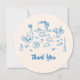 Det här charmiga bröllopsfest-kortet i blått och krämfärgat tackar är baserat på den populära handritade trenden med fransk eller italiensk inspirerad mat och dryck i en lekfull, klotter- och krafsstil. Designen är perfekt för en bröllopsbrunch eller fikaparty. Den visar handritade illustrationer av en vas med blommor, tårta, tekopp, tekanna, croissanter, jordgubbar, kniv och gaffel samt ett ljusstake.