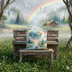 Träd in i en drömlik värld där fantasin möter stillhet i detta fantasifulla landskap. En lysande jordklot svävar över en frodig, förtrollad skog, omgiven av en strålande regnbåge och flockar av svävande vita duvor. Nedanför speglar en fridfull sjö himlens magi, med eleganta svanar som glider förbi och ett stort piano som står stilla i vattnet – en inbjudan att förlora sig själv i harmonisk ro. En mysig träkoja vilar vid stranden under höga tallar och vattenfall, omgiven av livfulla blommande blommor och mjuk dimma. Denna surrealistiska naturscen är rik på lugnande färger och fantasielement, perfekt för alla som dras till magiska escapader och fredfull bildvärld. Det mjuka ljuset och den detaljerade kom