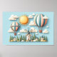 En förtjusande illustration som fångar en lekfull, vintageinspirerad scen i en söt, tillplattad 2D-stiliserad stil. Två charmiga varmluftsballonger svävar stillsamt genom en himmel fylld med luddiga, tecknade moln. En stor, rund sol lyser glatt och tillför värme till den övergripande kompositionen. Nedan är landskapet prickigt med rustika väderkvarnar och tallar, vilket skapar en pittoresk lantlig känsla. Hela scenen är renderad i ljusa, pastellfärger, vilket ger den en fräsch och inbjudande framtoning. Designen omfattar en 2D-plastisk estetik, med rena linjer och förenklade former som bidrar till dess nyckfulla och bubbliga karaktär.