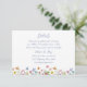 Dela dina bröllopsdetaljer med stil med detta fantasifulla inklusionskort med handritade klotterblommor, ömtåliga blå fjärilar och mjuk handskriven skrift. Den luftiga botaniska konstnärliga verket i blekblått, rosa, gult, lavendel, persika, grönt och orange ger designen en lekfull men ändå elegant känsla, perfekt för en färgrik trädgårdsinspirerad brölloppsserie. Anpassa texten, ändra teckensnittsstilar och teckensnittsfärger och uppdatera bakgrundsfärgen för att skapa en vackert koordinerad look.
