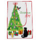 På vardera sidan av denna Helgdag-presentsäck sitter en nyfiken svart katt bredvid ett Helgdag träd och tittar som en tjurfäktning på den. Paket är spritt över kortfattat inslagna gåvor. I den röda och grönt texten står det "Jul JOY". Cute!