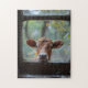 En nyfiken brun ko gazas genom ett fönster av vättat trä, vilket framkallar naturkänslor och charm på landsbygden, med en grön och en lugn, rustik bakgrund.