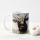 Den nyfikna svarta anguskon vill veta vad som finns i mugg.